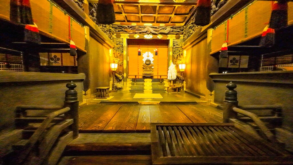 秋宮のシンボルである神楽殿。そこには、出雲大社を彷彿とさせる長さ約7.5メートル、重さ約1トンの巨大な注連縄が鎮座しています。夜間は絶妙な角度からライトアップされ、縄の編み目ひとつひとつに深い陰影が刻まれます。 昼間には気づかなかった造形美の力強さに、思わずシャッターを切る手が止まるはずです。