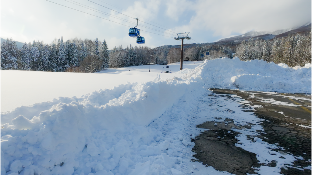 本日12月27日現在、IC出口からスキー場までの主要道は完璧に除雪されていますが、道幅が狭くなっている箇所があります。また、杉野沢エリアに入ると民宿街特有の細い道が増えるため、対向車とのすれ違いには十分注意が必要です。