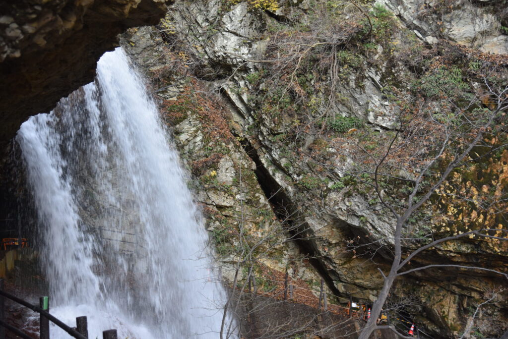 駐車場から遊歩道を数分下ると、次第に轟音が大きくなり、ひんやりとした空気が肌を包みます。滝の裏側に入ると、視界の半分を水の幕が覆い、太陽の光が水飛沫に反射してキラキラと輝く幻想的な光景に出会えます。