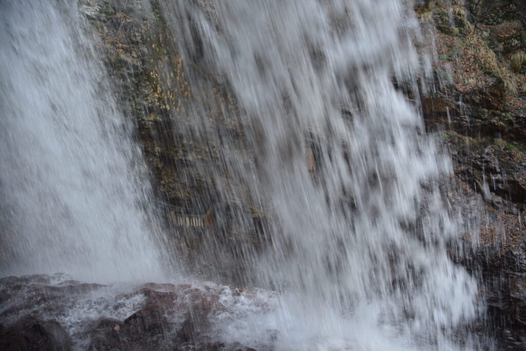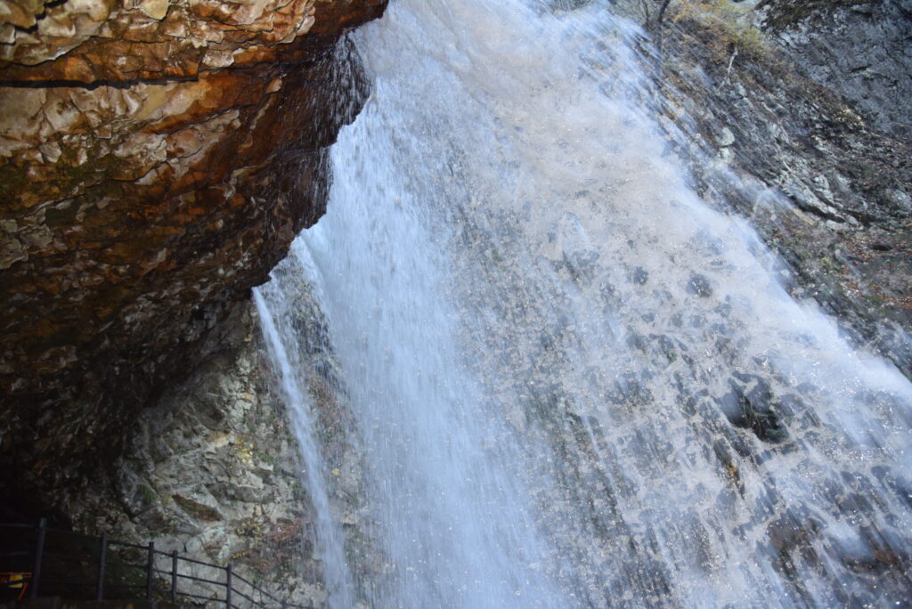 - 「音」の反響: 岩壁の内側は、まるで天然のホール。水が叩きつけられる音が岩肌に反射し、耳を塞いでも体内に直接響いてくるような圧倒的なエネルギーに包まれます。