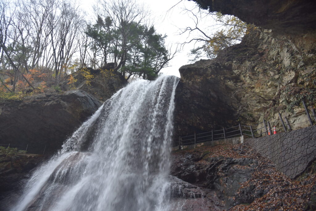 落差約30メートルの垂直な崖を、松川の豊かな水が猛烈な勢いで叩きつけます。長年の浸食によって削り取られた岩盤の内側が遊歩道となっており、頭上を水が飛び越えていく様はまさに圧巻。自然が作り出した巨大な屋根の下で、遮るもののない水の躍動を間近に感じることができます。