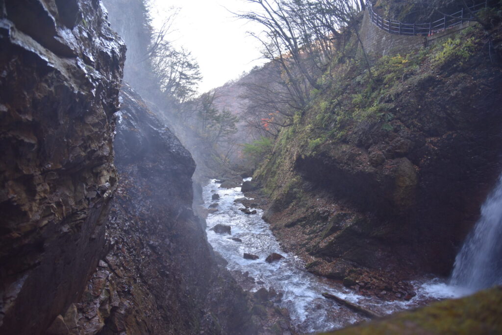 長野県高山村、上信越高原国立公園内に位置する松川渓谷。その深く険しいV字谷に、突如として現れるのが「雷滝」です。最大の特徴は、なんといっても滝の裏側を通り抜けられる「裏見の滝」であること。