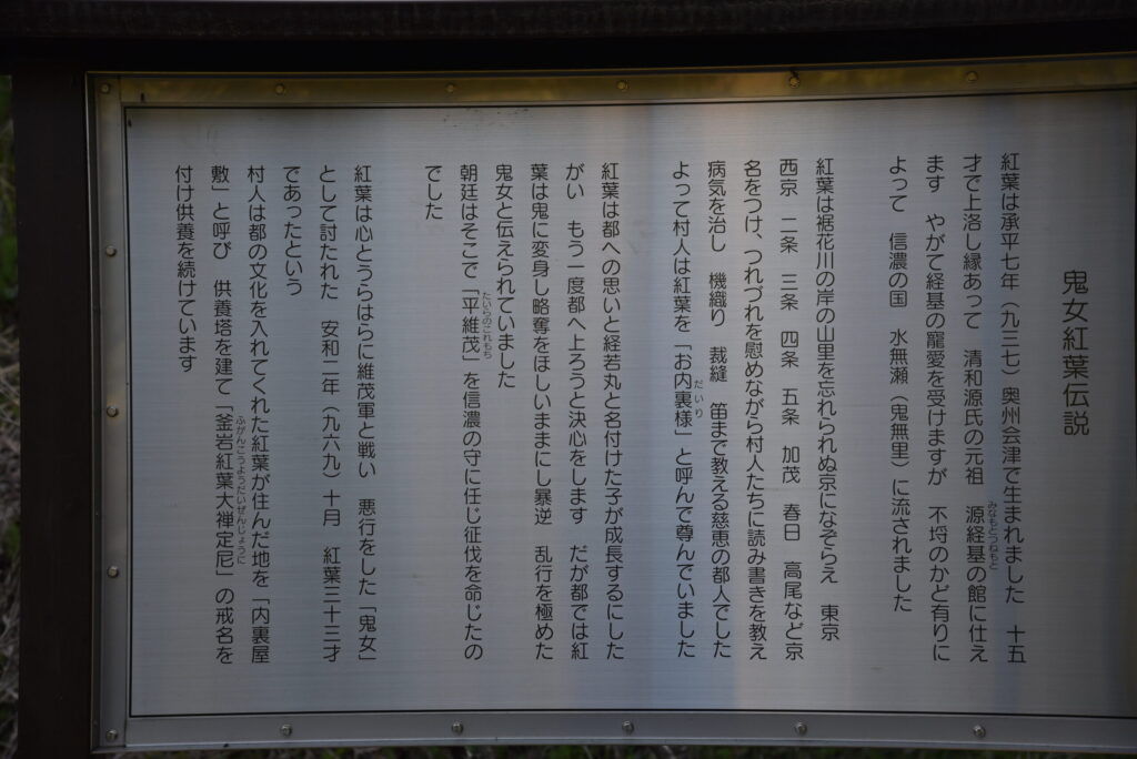 紅葉が鬼無里で暮らしていた居住地の跡が奥裾花渓谷への道路脇に残っている。