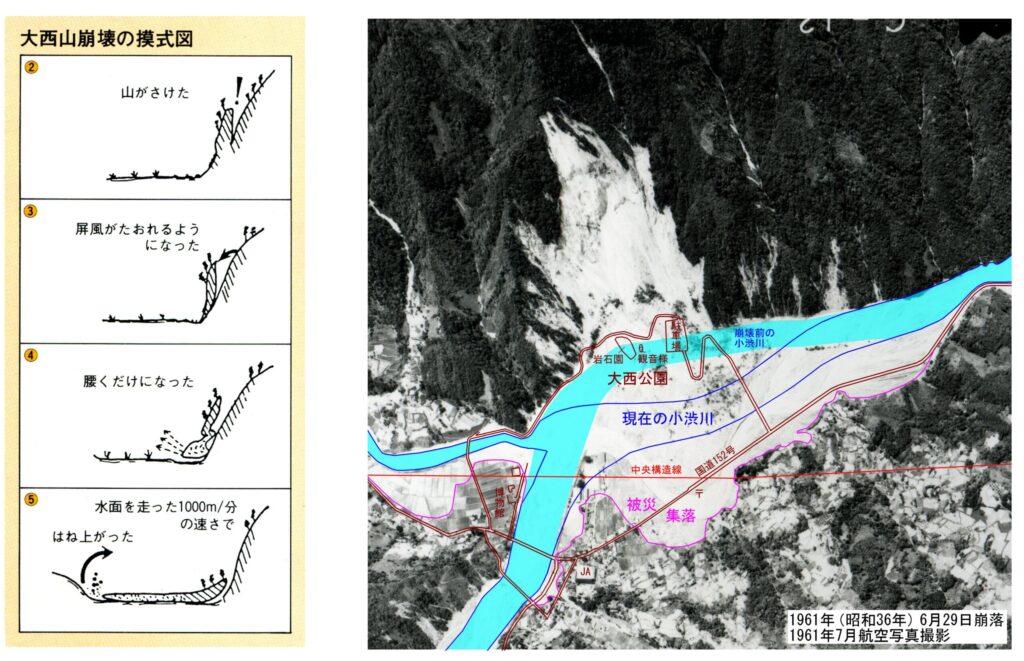 - 崩落した大量の土砂や石が小渋川をせき止め、川の増水した土砂と一緒になって対岸の集落を山津波となって直撃しました。この山津波の破壊力は凄まじく風圧で自動車が吹き飛んだという記録があります。