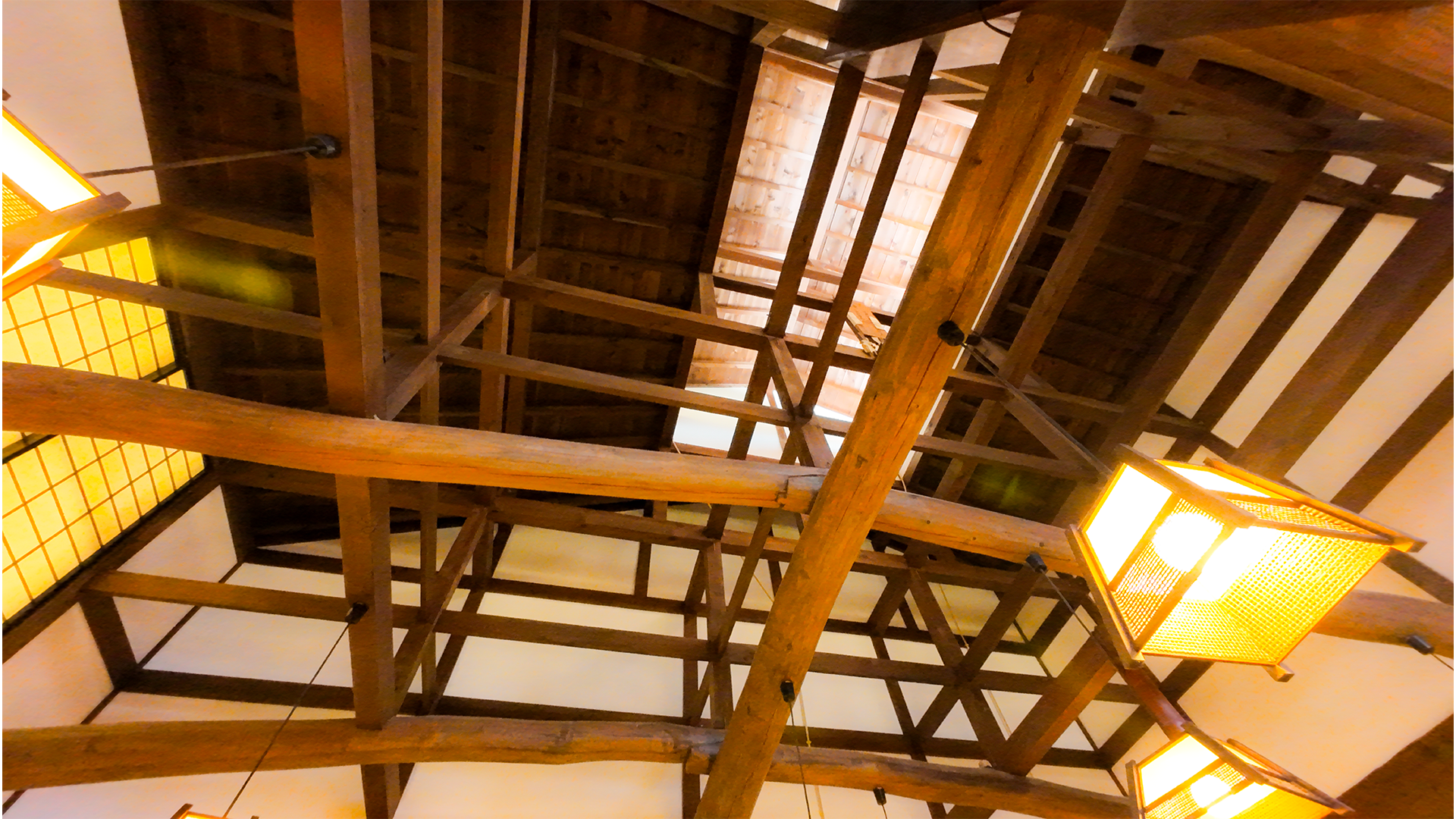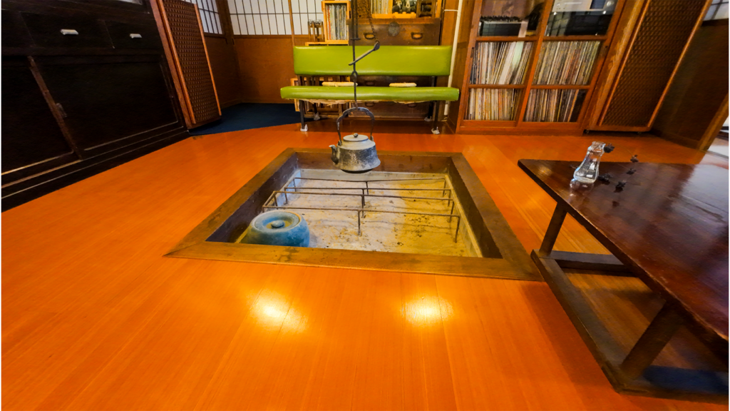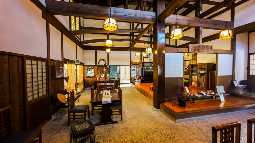 11時15分過ぎにお店に入ると、奥からお店の方が来られて、テーブル席と座敷席どちらにしますかと聞かれたので、テーブル席をお願いした。玄関を入って店のその広さに驚いた。ゆうに50畳以上はあろうか?昔の農家の1軒家をリフォームされている様に思うが、平屋作りで囲炉裏もあり、土間の部分がテーブル席となっているが、土間の部分も結構な広さがある。また単に広いだけでなく天井の高さもあり、かつ天井の梁の作りも立派である。天井部には天窓があり、採光されており、適度な暗さと明るさのある実に心落ち着く空間だ。席に着くとそば茶と箸休めを頂いた。